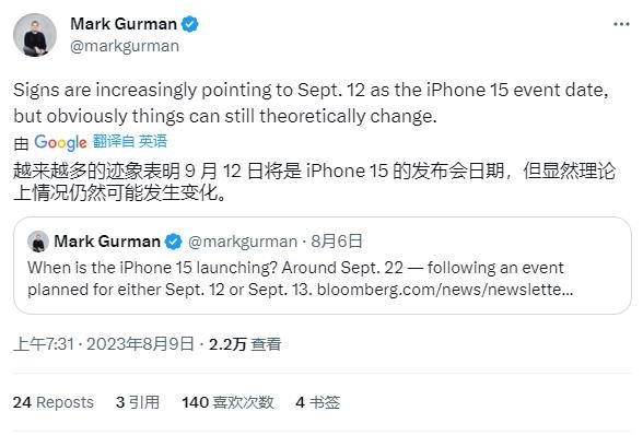 翻譯古爾曼的推文內(nèi)容如下:“越來越多的跡象表明,蘋果已挑選 9 月 12 日星期二,來發(fā)布 iPhone 15 系列。不過理論上蘋果也會做出調(diào)整”。