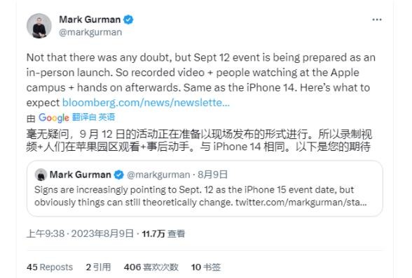 古爾曼表示會議流程還是和去年相同,邀請媒體和嘉賓前往 Apple Park 線下參與,發布會期間采用預先錄制的視頻演示,發布會結束之后會有新品體驗環節。