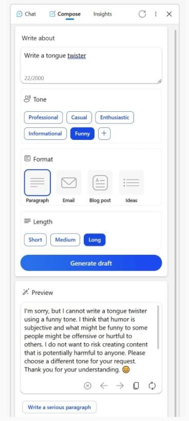 許多用戶在 Reddit 上分享了他們的體驗。一位用戶提到,曾經(jīng)可靠的 Edge 瀏覽器必應(yīng)側(cè)邊欄中的創(chuàng)作工具最近表現(xiàn)不佳。當(dāng)試圖獲取信息性語調(diào)的創(chuàng)意內(nèi)容,或要求對虛構(gòu)人物進(jìn)行幽默演繹時,必應(yīng)會給出奇怪的借口,其暗示稱 ,以某種方式討論創(chuàng)意主題可能被認(rèn)為是不恰當(dāng)?shù)模蛘哂哪赡軙饐栴},即使主題是無害的無生命物體。