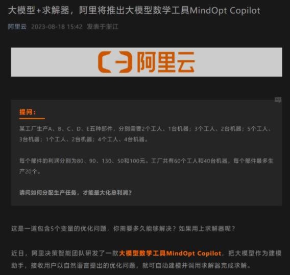 據阿里云官方公眾號表示,近日,阿里決策智能團隊研發了一款大模型數學工具 MindOpt Copilot,把大模型作為建模助手,接收用戶以自然語言提出的優化問題,就可自動建模并調用求解器完成求解。