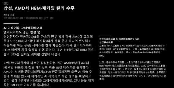 據外媒 hankyung 消息,AMD 已與三星電子達成協議,三星的 HBM3 內存和封裝技術將被 AMD MI300X GPU 采用,外媒預計明年三星電子將在 HBM 市場獲得 50% 的份額。