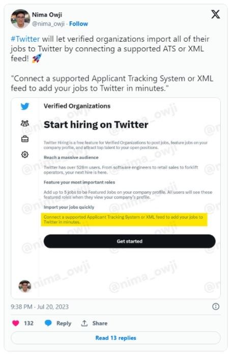 X 公司已經邀請多家企業入駐,支持 ATS 或者 XML 格式導入招聘信息,官方表示整個過程只需要幾分鐘就能完成,聲稱可以幫助企業擴大招聘面,吸引更多人才。