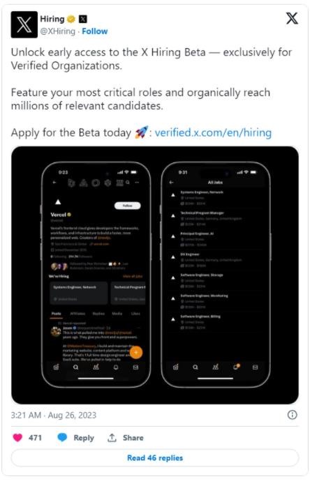 在私信中推出視頻聊天、語音聊天功能之后,X 今天宣布上線 Beta 版 X Hiring 平臺,希望將其打造成為比肩 LinkedIn 的招聘平臺。