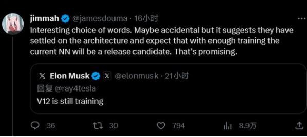 馬斯克昨日在 X 平臺回應一位用戶提出的有關特斯拉公司“何時能夠正式推出 FSD V12 版本”時表示,“FSD V12 正在訓練中,而訓練計算很快將不再是一個限制因素。”