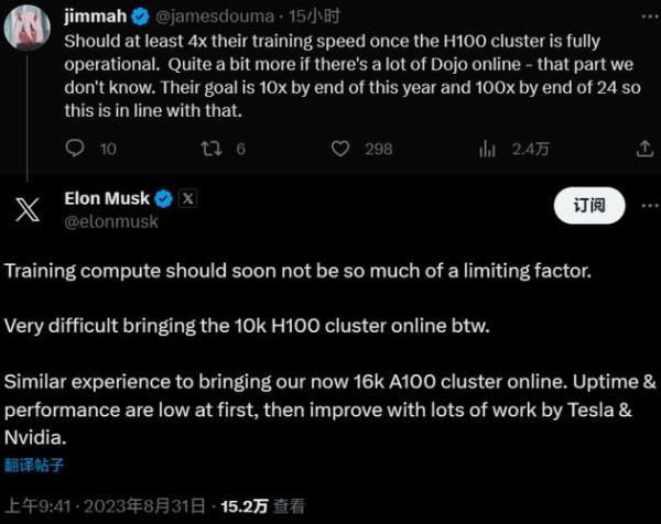 這位名為“jimmah”的用戶表示:“一旦特斯拉的 H100 集群完全投入使用,特斯拉的訓練速度應該至少提高 4 倍。如果有很多 Dojo 上線的話,會更快一點 —— 但這部分我們不知道。特斯拉的目標是到今年年底達到 10 倍,到 2024 年底達到 100 倍,所以這與他們的目標一致。”