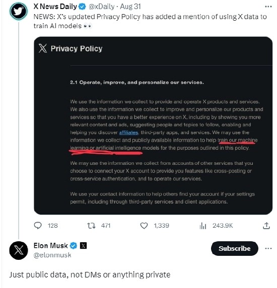 對此,馬斯克在 X 上回應稱,X 只會使用公開的信息來訓其練人工智能模型,不會使用任何私有的內容。