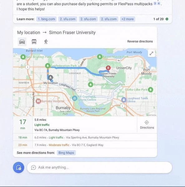 微軟在博文中表示,用戶和必應聊天,內容中不僅提供到達目的地的最優路徑,還會在地圖中顯示相關路徑。