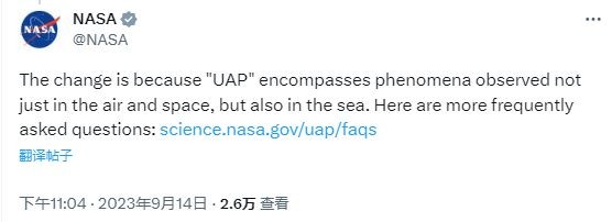 UAP 的全稱叫做 Unidentified Anomalous Phenomena,而公眾更喜歡把這類東西稱為 UFO,即不明飛行物。至于為什么要起一個大家都不熟悉的名字,NASA 解釋稱,UFO 指的是空中觀察到的不明現(xiàn)象,而 UAP 的范圍還包括海洋。