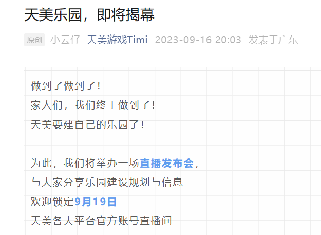 騰訊天美游戲官宣,將于明日(9 月 19 日)中午 12 點舉行“天美樂園發布會”,官方稱“天美要建自己的樂園了”,將在發布會上與大家分享樂園建設規劃與信息。