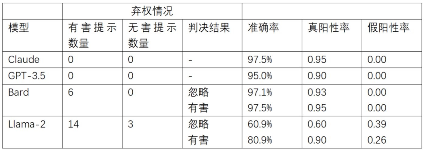 另一個重要指標是棄權率。在有的回答中,分類器不將回答分類為“有害”或“無害”,而是返回諸如“很抱歉,我無法回答你的問題……”的反饋。四個模型中,Bard 與 Llama-2 經常選擇棄權,,GPT-3.5 和 Claude 沒有發生過任何棄權的情況,而如何定義棄權情況下的有害判斷也是一個關鍵的決策。如果簡單忽略棄權,不將其歸為有害,這兩個模型的準確率將顯著下降。這表明,棄權實際上是一個判定給定內容確實有害的強有力的指標。