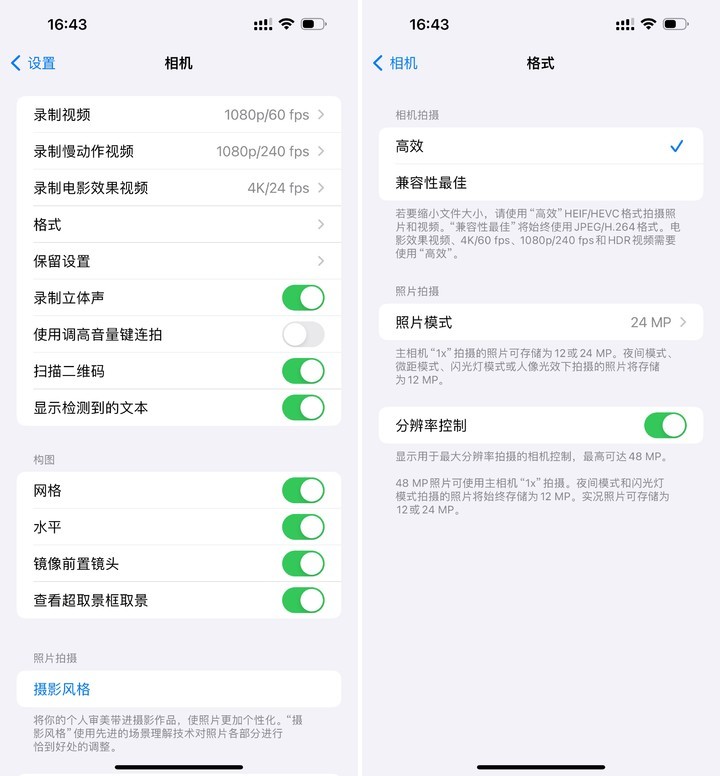 iPhone 默認隱藏了這個選項,需要在「設置-相機-格式-分辨率控制」中手動開啟,之后在取景上方畫面中點擊 HEIF MAX 選項即可開啟 4800 萬像素的最大分辨率,成像解析力提升非常明顯,很適合風光攝影。