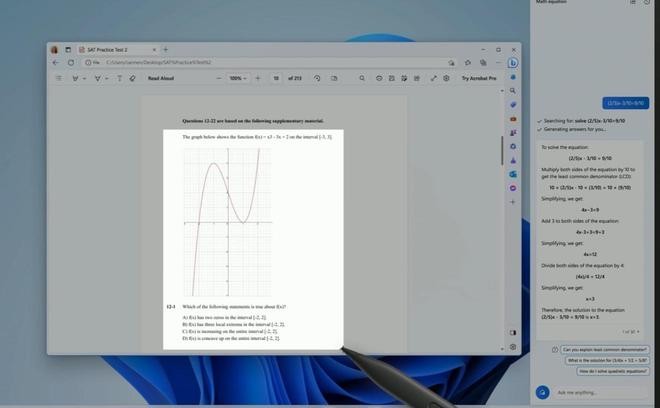 在今天的發布會上,微軟還發布了一個名為 Ink Anywhere 的新功能。除了可以用手寫筆書寫數學等式提問外,手寫筆還能直接選中帶圖片的數學問題,交給 Copilot 進行解答。
