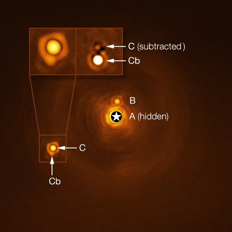 這項(xiàng)新的研究結(jié)果表明,該恒星系統(tǒng)中包含一顆圍繞恒星 C 運(yùn)行的隱藏星 ——C b,屬于氣態(tài)巨行星,其質(zhì)量大約是木星的 14.8 倍,繞恒星一周大約需要 285.2 年,距離恒星約 23.04 個(gè)天文單位。