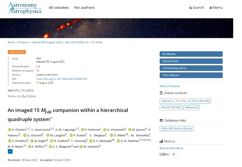 研究人員指出:“事實(shí)上,這是首個(gè)使用直接成像技術(shù)發(fā)現(xiàn)的分層四重系統(tǒng),這對于了解像這樣的復(fù)雜恒星系統(tǒng)是如何形成和演化的屬于是無價(jià)之寶。”