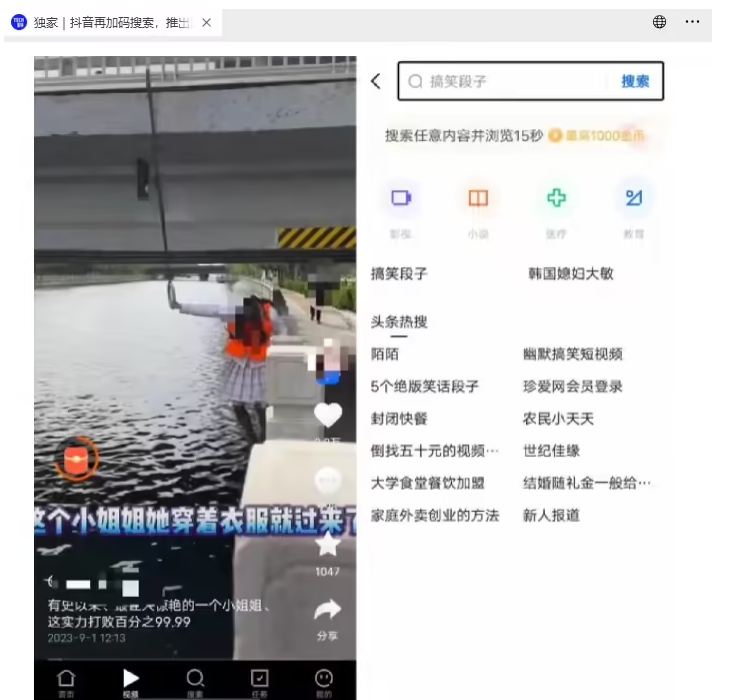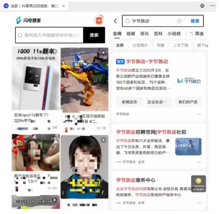 實測發現,“閃電搜索”的搜索結果由頭條搜索提供,第一印象類似于阿里的夸克搜索,看起來并沒有太多特殊的地方。