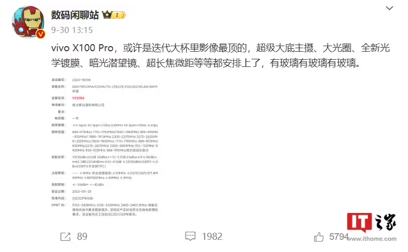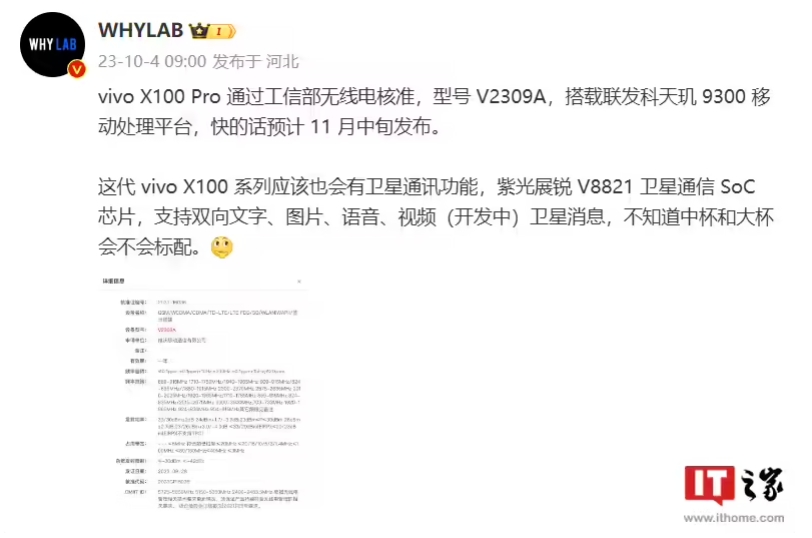 此前一款型號為“V2309A”的 vivo 新機通過了工信部無線電核準(zhǔn),預(yù)計為 vivo X100 Pro,博主 @WHYLAB 透露這款新機有望搭載衛(wèi)星通訊功能。