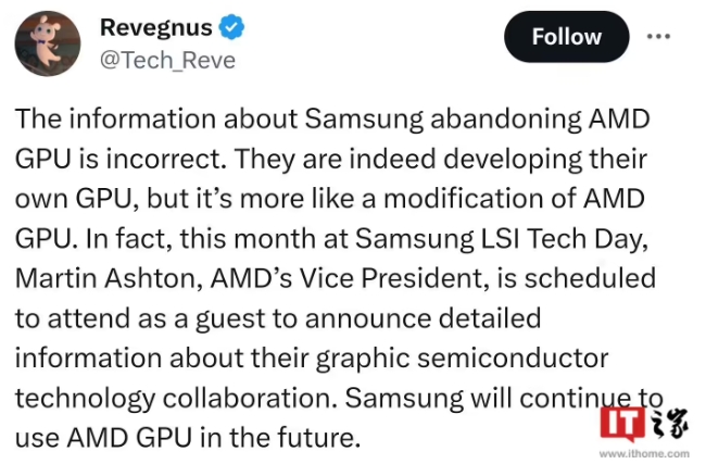 針對“三星將終止與 AMD 在移動 GPU 上的合作”的傳聞,博主 @Tech_Reve 認為消息并不準確,并給出自己的看法。
