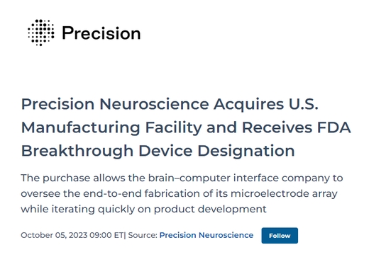 這家工廠將幫助Precision加快開發速度,以期實現2024年獲得監管批準的目標。在新聞稿中,公司還宣布其系統已獲得美國食品和藥物管理局(FDA)授予的“突破性設備”認定,將有助于加快其最終獲得批準。
