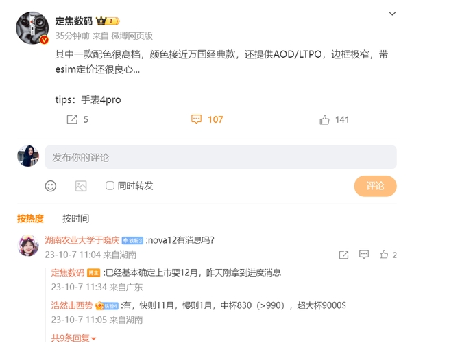 近日,有網友詢問數碼博主“定焦數碼”:華為nova 12有消息嗎?該博主回復道,“已經基本確定上市要12月份,昨天剛拿到進度消息。”由此來看,目前華為nova 12系列手機或已基本定型。