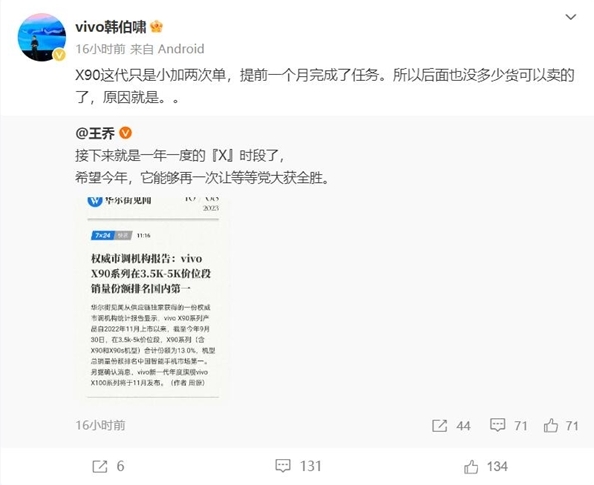 vivo韓伯嘯表示,vivo X90系列這代加了兩次單,但還是提前一個月完成了銷售任務,后面沒有多少貨可以賣了。