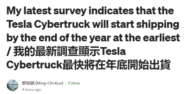 郭明錤認為 Cybertruck 對特斯拉未來數年內營收與利潤成長的顯著貢獻是顯而易見的,且此貢獻在可見未來不受季節性與景氣衰退影響。