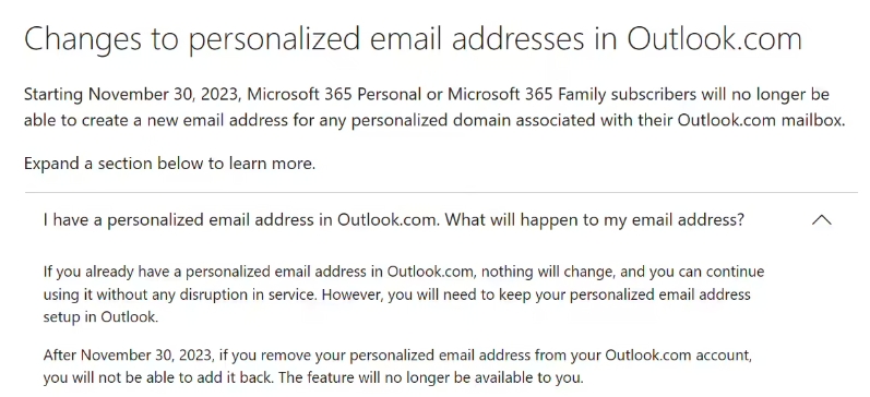 在 11 月 30 日后,現有 Outlook.com 域名的個人郵件還是可以繼續使用,用戶也可以為 Outlook.com 域名的個人郵件設立別名(alias),但無法再綁定任何個人域名。