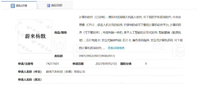 國家知識產(chǎn)權(quán)局商標(biāo)局網(wǎng)站顯示,蔚來汽車科技(安徽)有限公司于 2023 年 9 月 21 日遞交了“蔚來?xiàng)顟?rdquo;的注冊申請,國際分類為科學(xué)儀器,當(dāng)前商標(biāo)狀態(tài)為等待實(shí)質(zhì)審查。