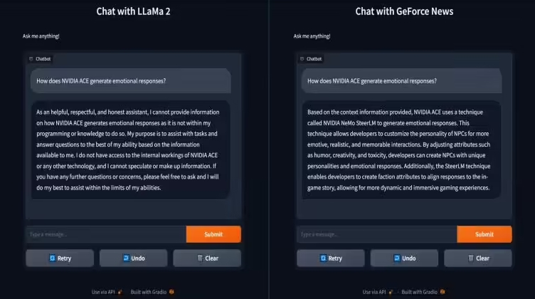 博客文章展示了一個 TensorRT-LLM 的例子。當向 LLaMa 2 基礎模型提出“《心靈殺手 2》集成了 NVIDIA 的哪些技術?”這一問題時,它給出“游戲尚未公布”這一毫無幫助的回答。相反,使用 RAG 將 GeForce 新聞添加到向量庫中,并連接到相同的 Llama2 模型,不僅得到正確答案 ——NVIDIA DLSS 3.5、NVIDIA Reflex 和全景光線追蹤,而且在 TensorRT-LLM 加速的助力下響應速度更快。這種速度與能力的結合為用戶提供更智能的解決方案。