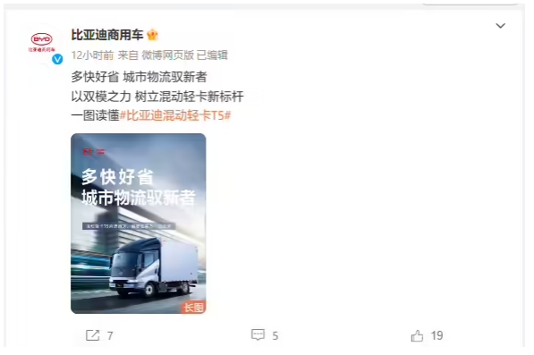 比亞迪昨晚在江蘇淮安發(fā)布了混動(dòng)輕卡新品 T5,該車首發(fā)搭載 DM 1.5 混動(dòng)系統(tǒng),號(hào)稱滿載狀態(tài)下 0-50km/h加速 5.5 秒,滿油滿電狀態(tài)最高續(xù)航 1000km。