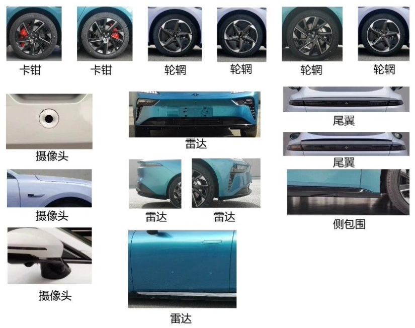 選裝件包括紅色卡鉗、尾翼、側(cè)包圍等,以及不同樣式的輪輞,可選不同位置攝像頭、雷達。