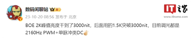 在該消息官宣之前,博主 @數碼閑聊站 爆料稱,一加新機搭載的 2K 屏幕,峰值亮度達到了 3000nit,后面機型用的 1.5K 屏幕突破 3000nit,目前調光都是 2160Hz PWM + 單脈沖類 DC。