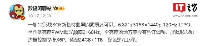 一加 12 將采用京東方新基材曲面屏,屏幕尺寸為 6.82 英寸,分辨率為 3168×1440p,支持 120Hz LTPO 自適應刷新率。此外,該博主還透露,一加 12 的屏幕形態和邊框控制參考 OPPO Find X6 Pro(注:居中單孔),頂配提供 24GB+1TB 大內存,配色有黑、白、綠三款。