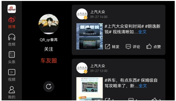 除了具備基礎的登錄、點贊、轉發等操作,微博車載APP用戶可以查看微博內容流,包括推薦內容和車友圈精選內容等,極大地豐富了社交屬性,并拉近了車主們在駕駛體驗中的距離,拓展了車友圈交流范圍,有助于形成新的社交關系。