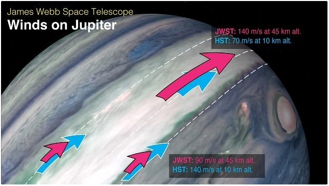 天文學家近日通過詹姆斯?韋伯天文望遠鏡拍攝的木星照片,監測發現了一次遠超預期的強烈急流(jet stream),強度甚至超過 5 級颶風。