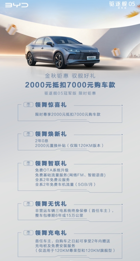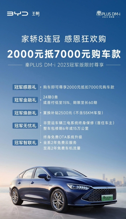 比亞迪官方宣布,比亞迪秦 PLUS DM-i 冠軍版、驅逐艦 05 冠軍版兩款車型限時開啟“2000 元抵扣 7000 元購車款”優惠活動,活動時間 10 月 20 日-11 月 30 日。