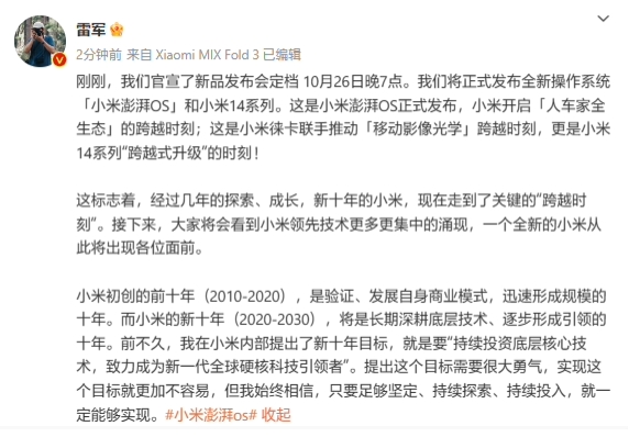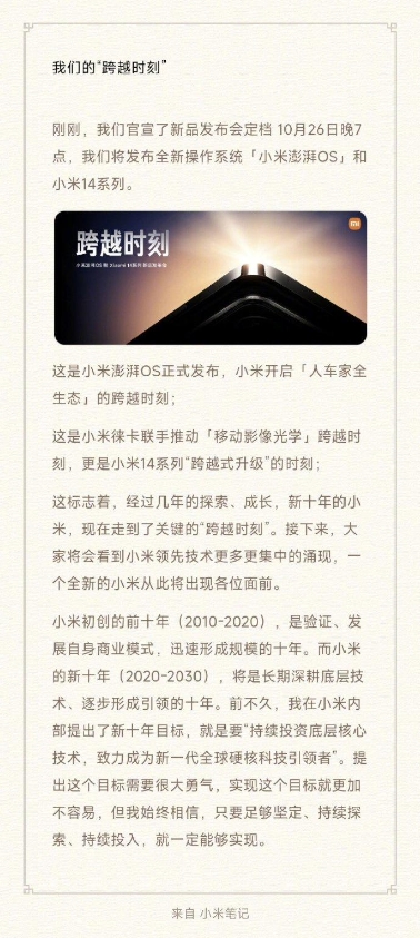 在小米官宣新品發布會定檔 10 月 26 日晚 7 點之后不久,小米創始人雷軍發文稱,此次發布會將是小米澎湃 OS 正式發布、小米開啟“人車家全生態”的跨越時刻,也是小米徠卡聯手推動“移動影像光學”的跨越時刻,更是小米 14 系列“跨越式升級”的時刻。