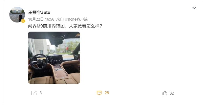昨日開始,微博多名博主陸續曬出了問界旗艦 SUV 車型 M9 的前排內飾布局,這款新車的座艙和中控部分這次以更清晰的方式展現。