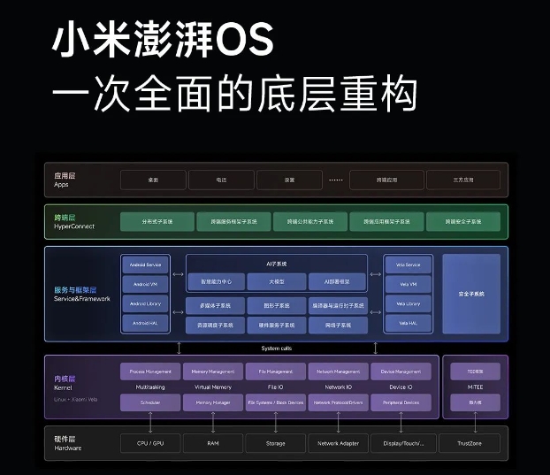 在最底層的系統內核層,小米將自研的 Vela 系統內核與深度修改的 Linux 系統內核進行融合,重構了性能調度、任務管理、內存管理、文件管理等各個基礎模塊,實現了性能、效率的大幅提升。