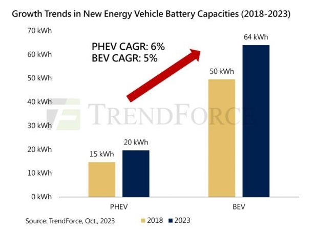 集邦咨詢在最新報告稱,插電混動汽車在 2015 年的市場占有率為 9%,預估 2023 年將增長到 21%,平均電池組容量由 2018 年的 15 千瓦時增至 2023 年的 20 千瓦時。