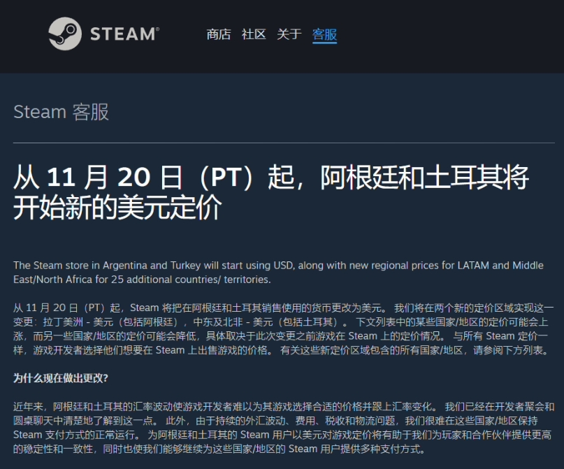 Steam 官網日前發布公告,自 11 月 20 日起,Steam 將把在阿根廷和土耳其銷售使用的貨幣改為美元。