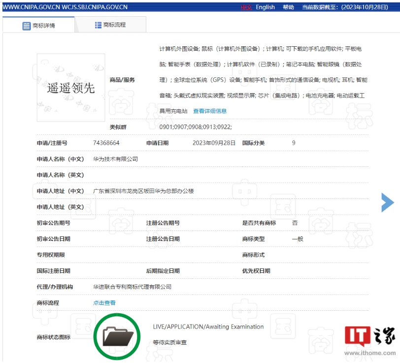 近日,華為技術有限公司申請注冊“遙遙領先”商標,國際分類為運輸工具、科學儀器,當前商標狀態為等待實質審查。近期,因華為 Mate60 系列手機發售,“遙遙領先”成為網絡熱詞。