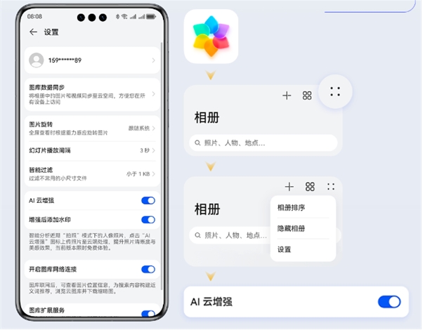 升級(jí)后,大家就能在圖庫(kù)的設(shè)置中找到“AI云增強(qiáng)功能”,打開(kāi)即可。
