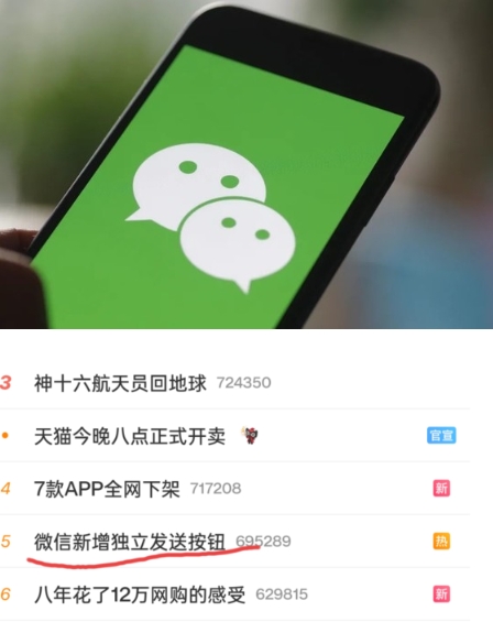 “微信新增獨立發送按鈕”這一詞條登上了微博熱搜,并且高居榜單第五,這讓不少人有些納悶。不過點開后才發現,原來是iOS端微信迎來了一次“史詩級”更新。