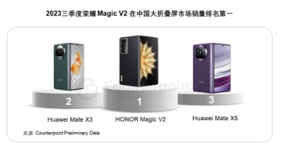 另外,如果用戶有商務、社交等高階需求,也可以選擇8999元起、產品力更加強勁的榮耀Magic V2。Counterpoint數據顯示,今年第三季度,在國內“大折疊”智能手機市場銷量排名中,榮耀Magic V2排名第一。艾瑞咨詢數據顯示,在今年7-8月的增量市場中,榮耀Magic V2以31.3%的存量用戶增長,奪得橫向折疊屏手機市場TOP1。