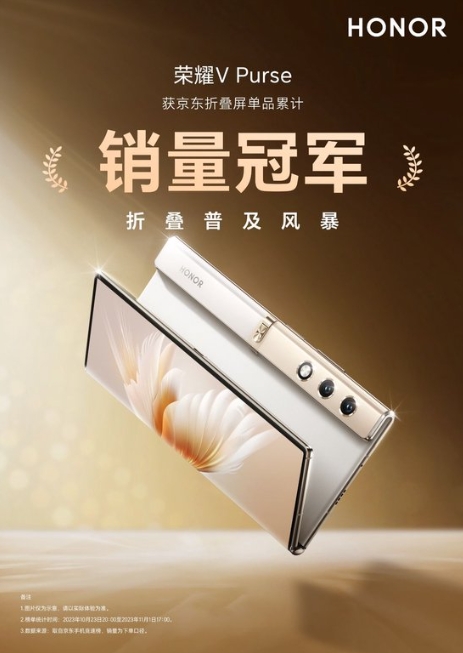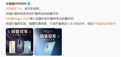 11月1日,榮耀官方戰報顯示,榮耀折疊屏手機取得雙十一“開門紅”:榮耀Magic Vs2斬獲京東&天貓雙平臺折疊屏單品銷量冠軍,榮耀V Purse斬獲京東折疊屏單品累計銷量冠軍,榮耀折疊屏家族斬獲折疊屏品類銷量冠軍。