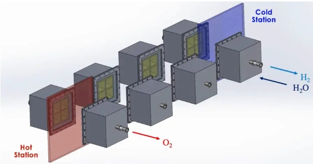 每個(gè)反應(yīng)堆將首先通過一個(gè)熱站,在那里它將暴露在高達(dá)1500攝氏度的太陽(yáng)熱量下。這種極端的高溫會(huì)有效地將氧氣從反應(yīng)堆的金屬中抽出。然后,這種金屬將處于“還原”狀態(tài)——準(zhǔn)備從蒸汽中吸收氧氣。為了實(shí)現(xiàn)這一目標(biāo),反應(yīng)堆將轉(zhuǎn)移到一個(gè)溫度在1000攝氏度左右的較冷的站,在那里它將暴露在蒸汽中產(chǎn)生氫氣。