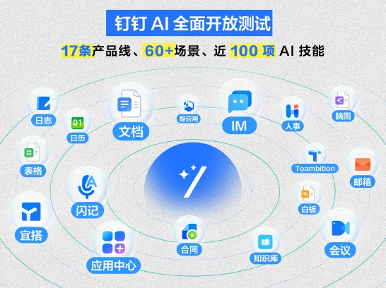 應用的豐富,是AI商業價值落地的基礎,也是從技術轉變為生產力的關鍵。此次,釘釘AI全家桶全面開放測試,包含17條產品線、超過60個場景,覆蓋AI技能近100種。