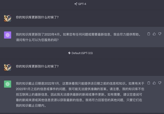 GPT-4的知識庫更新到2023年4月。目前ChatGPT中使用的GPT-4模型,已經將知識庫更新到了2023年4月,不過GPT-3.5的知識庫仍然停留在2022年1月。
