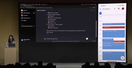 OpenAI工作人員Jessica shay現場演示了利用GPT Builder構建一個能與行程表互動的 GPTs。并以對話的形式命令 GPT 給 Sam Altman 發信息, Altman也在現場接收到了這條信息。