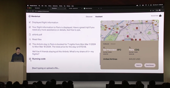 另一個更加專業的演示則是OpenAI 的工作人員現場演示Assistants API的用法:它不僅能列出巴黎旅游建議,還能在地圖上將計劃中提到的地點按類別標記出來。